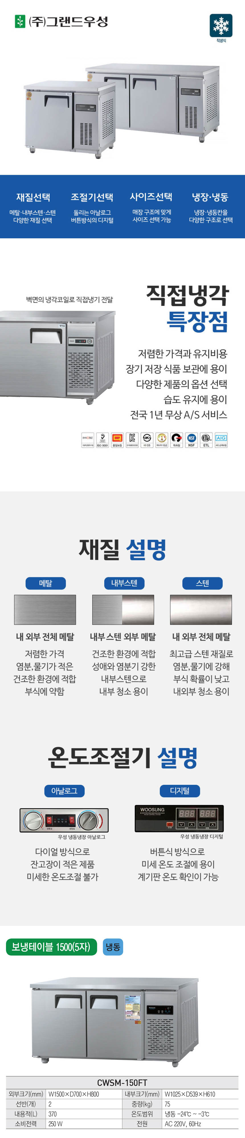 CWSM-150FT_내부스텐 유버스 [그랜드우성] 직냉식 테이블 냉동고 370L 내부스텐 제품분류 업소용 용량(총량) 300L이상 기능 2도어 AS기간 1년 최저 렌탈가 월 41,800 (렌탈가) 제휴카드 할인가 월 (렌탈가) 3년 4년 5년 할인 제휴카드 보기 렌탈신청 장바구니