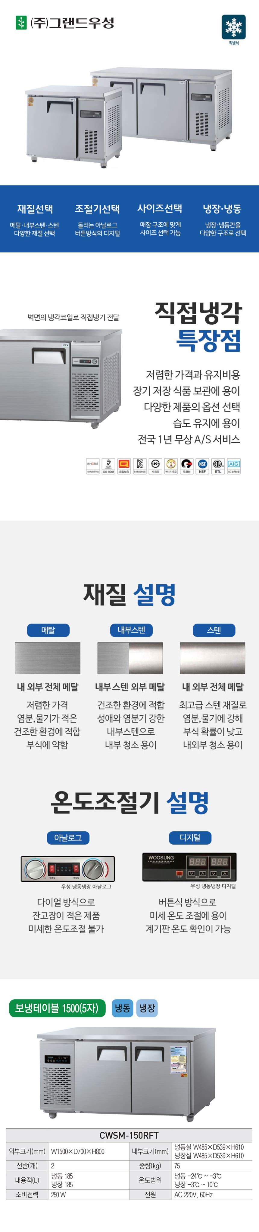CWSM-150RFT_올스텐 유버스 [그랜드우성] 직냉식 테이블 냉장고+냉동고 370L 올스텐 제품분류 업소용 용량(총량) 300L이상 기능 2도어 AS기간 1년 최저 렌탈가 월 46,300 (렌탈가) 제휴카드 할인가 월 (렌탈가) 3년 4년 5년 할인 제휴카드 보기 렌탈신청 장바구니