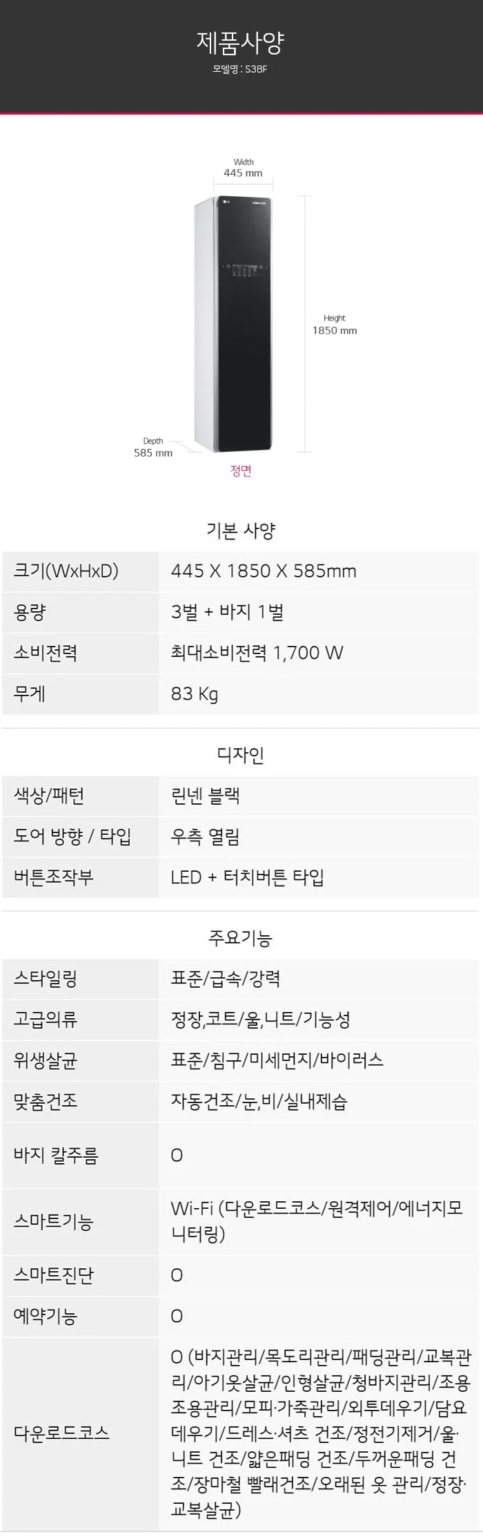 S3BF 유버스 [LG] 스타일러 린넨블랙 제품분류 스타일러 AS기간 1년 최저 렌탈가 월 43,800 (렌탈가) 제휴카드 할인가 월 (렌탈가) 3년 4년 5년 할인 제휴카드 보기 렌탈신청 장바구니