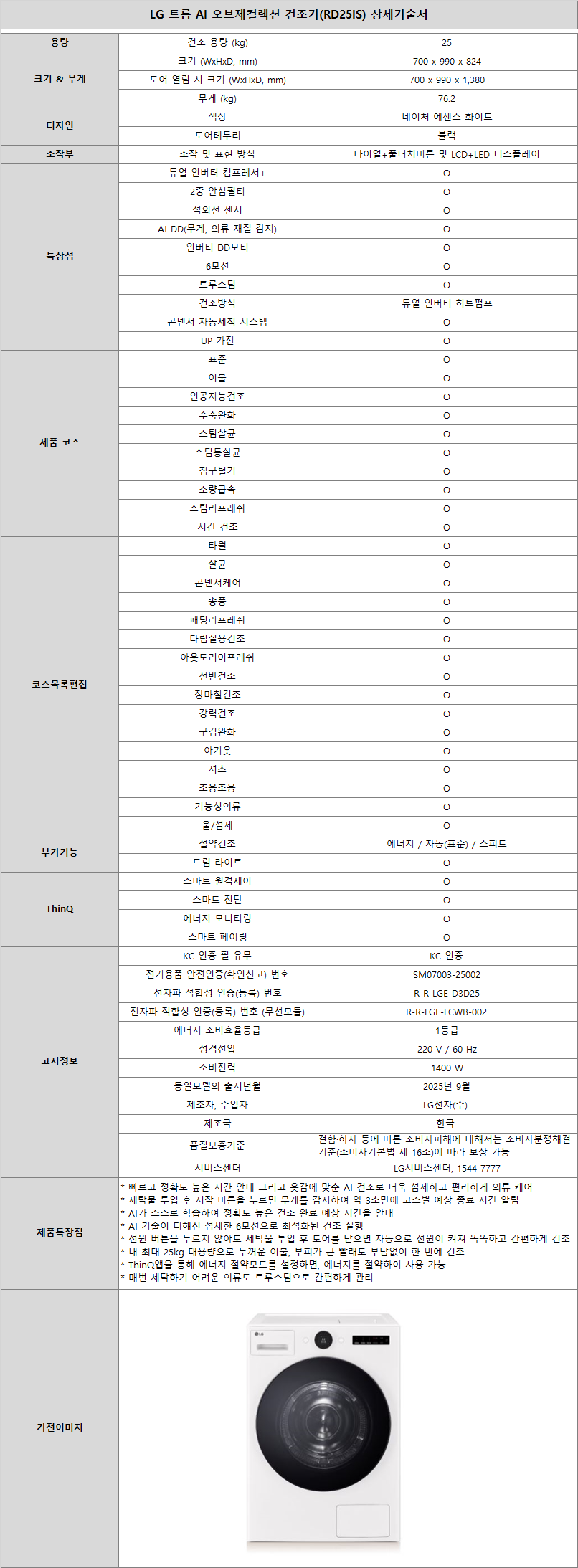 RD25IS 소노아임레디 [LG] 트롬 AI 오브제컬렉션 건조기 25kg 네이처에센스화이트 제품분류 생활가전 용량(총량) 25KG 구좌 4구좌 AS기간 1년 최저 렌탈가 월 66,000 (렌탈가) 제휴카드 할인가 월 (렌탈가) 1-200회 할인 제휴카드 보기 렌탈신청 장바구니