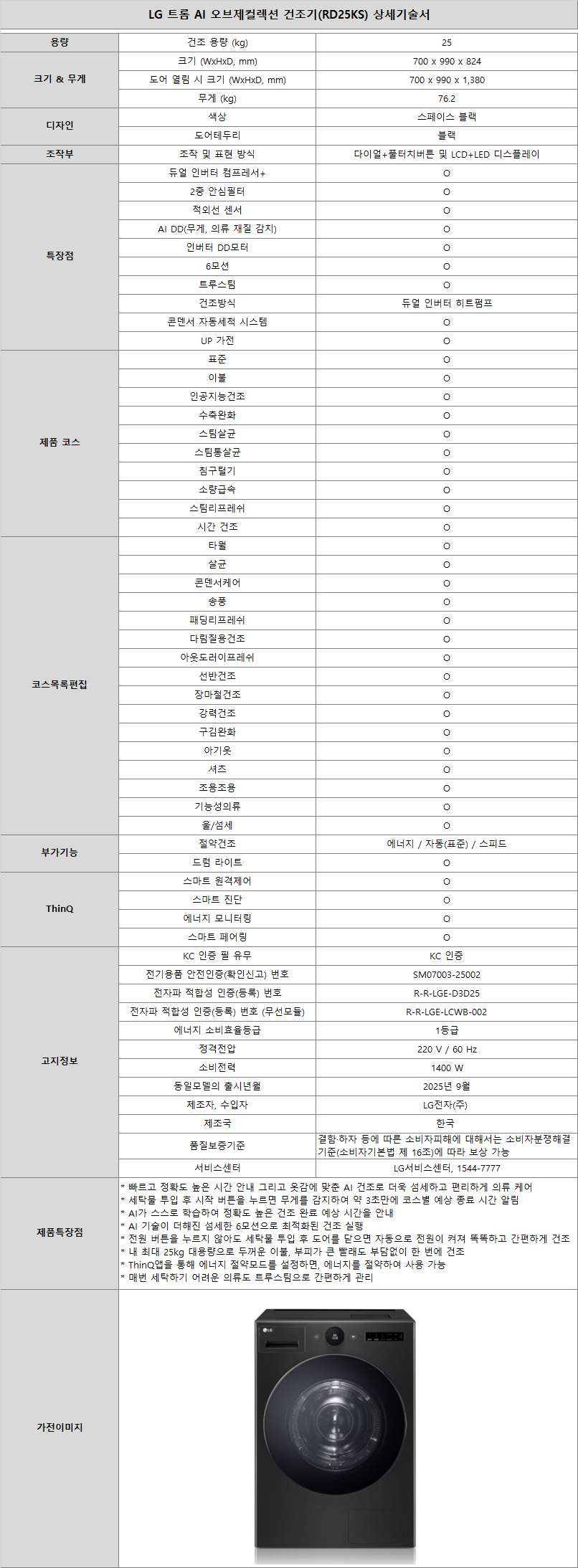 RD25KS 소노아임레디 [LG] 트롬 AI 오브제컬렉션 건조기 25kg 스페이스블랙 제품분류 생활가전 용량(총량) 25KG 구좌 4구좌 AS기간 1년 최저 렌탈가 월 66,000 (렌탈가) 제휴카드 할인가 월 (렌탈가) 1-200회 할인 제휴카드 보기 렌탈신청 장바구니